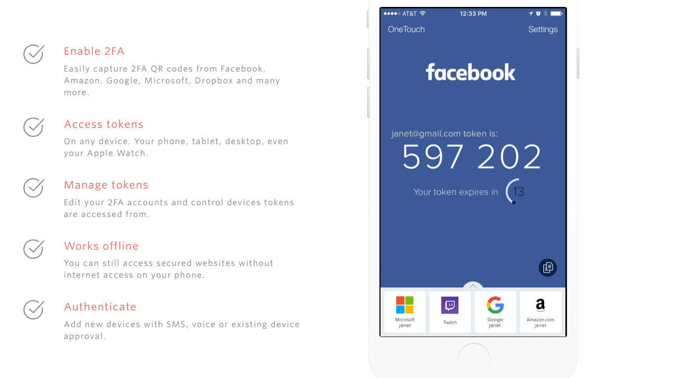 Above is what the application looks like when fully set up. As you can see on the image of the phone there is a token (2FA code) for Facebook. When you log in to Facebook it will ask for the token, and then you provide it. You can see that the token expires in 13 seconds. When that happens you will be provided a new Token. Sometimes it's best to wait for it to refresh instead of trying to log in with 5 seconds left. Below that is the other 2FA accounts that are synced with Authy for this user. If you need some help getting it set up make sure you check out the Authy Guides.