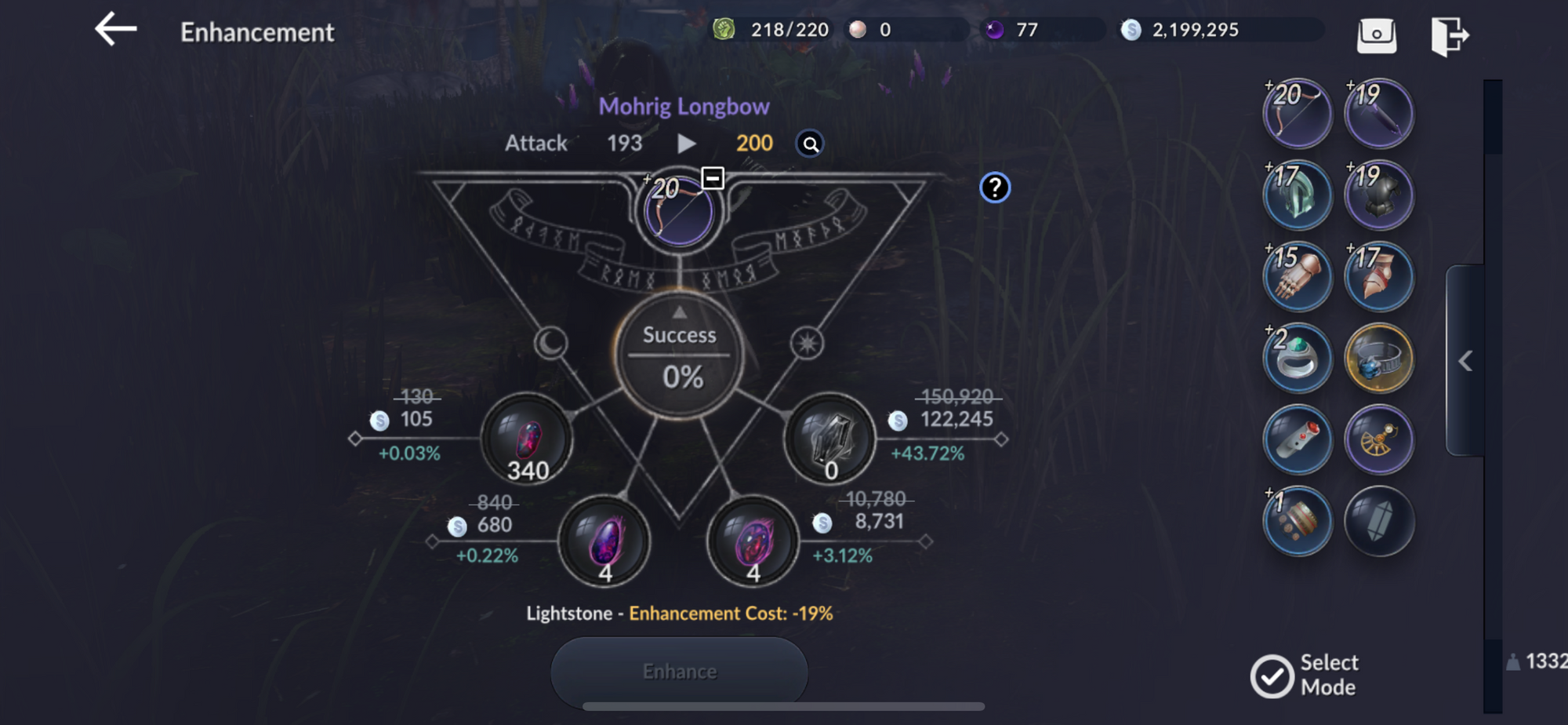 Just like Black Desert we have black stones and enchancing in the mobile version. As you can see I have 4 different stone options there. The green numbers is the chance of enchanting with that stone. As you can see the numbers are very low, the good thing about this is that they stack. For example I have 4x 3.12% stones. I could use all of those for ~12% chance to enchance. You can mix and match all the way up to 100%. If you fail it just eats your stones so far. You can save some of the stones with scrolls or by using silver.