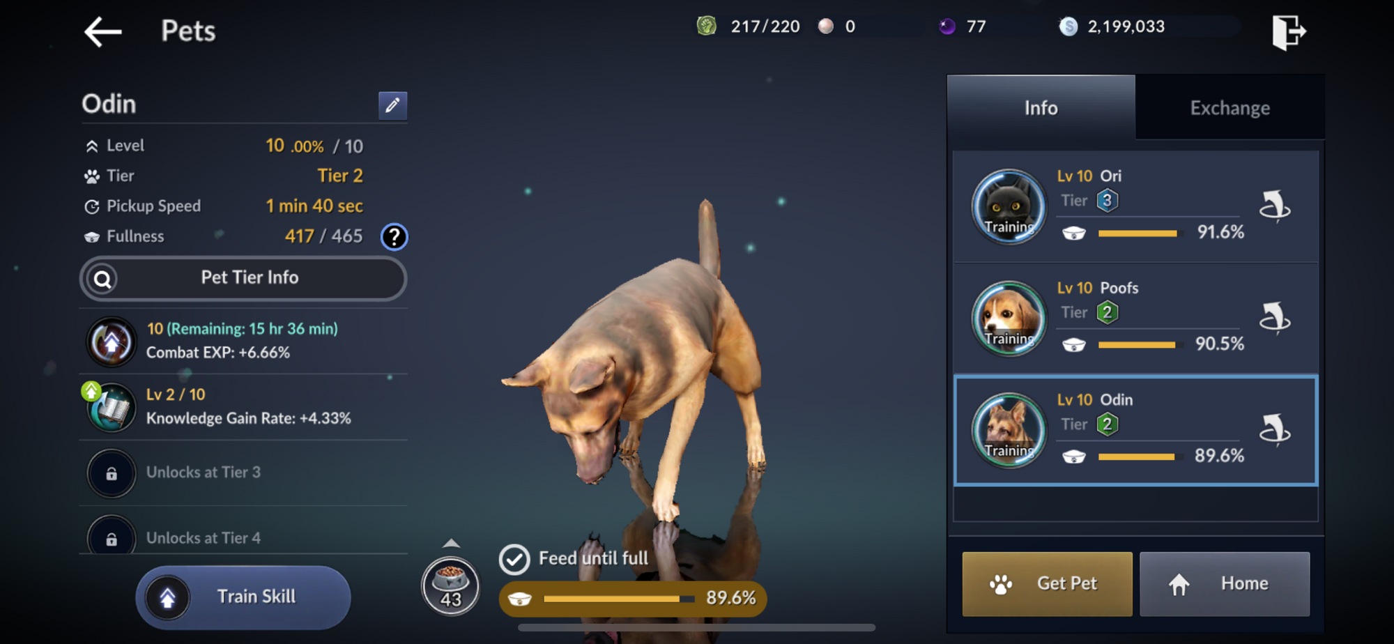 You can see that the pets also have skills that randomly come with them. Odin gives me combat EXP and Knowledge gained. You train them by paying silver and waiting a long time. Odin is a tier 2 pet and Ori is a tier 3. The tiers are important, the higher the tier the more skills they know. They also recover faster so they can loot even faster. I haven't noticed much different, but I'm sure it does add up. For example the difference in pick up speed between T2 and T3 is 5 seconds. To upgrade the tiers you need 2 pets of the same time. So Poofs and Odin won't work. They are both dogs but they are different pets. You need Odin which is a shepard and another dog that is a shepard.