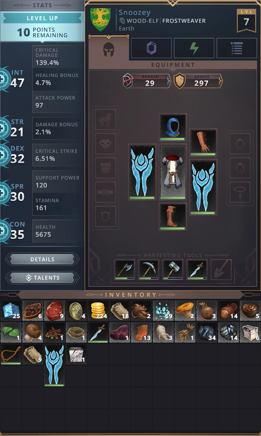 The inventory system seems pretty standard. You have your equipment currently equipped and your inventory/stats all in one screen. Every odd level you will gain some attribute points to put in to customize your character further. As you can see not all equipment is in one slot. The game has a looting system where you select what you want from the corpse by pressing "F". If you just want to loot everything then you press "G" you need to use your tools to gather resources. Each tool is used for a certain resource. For example, the knife is used to skin animals for their pelts The game feels as though there will be a lot of crafting to come.