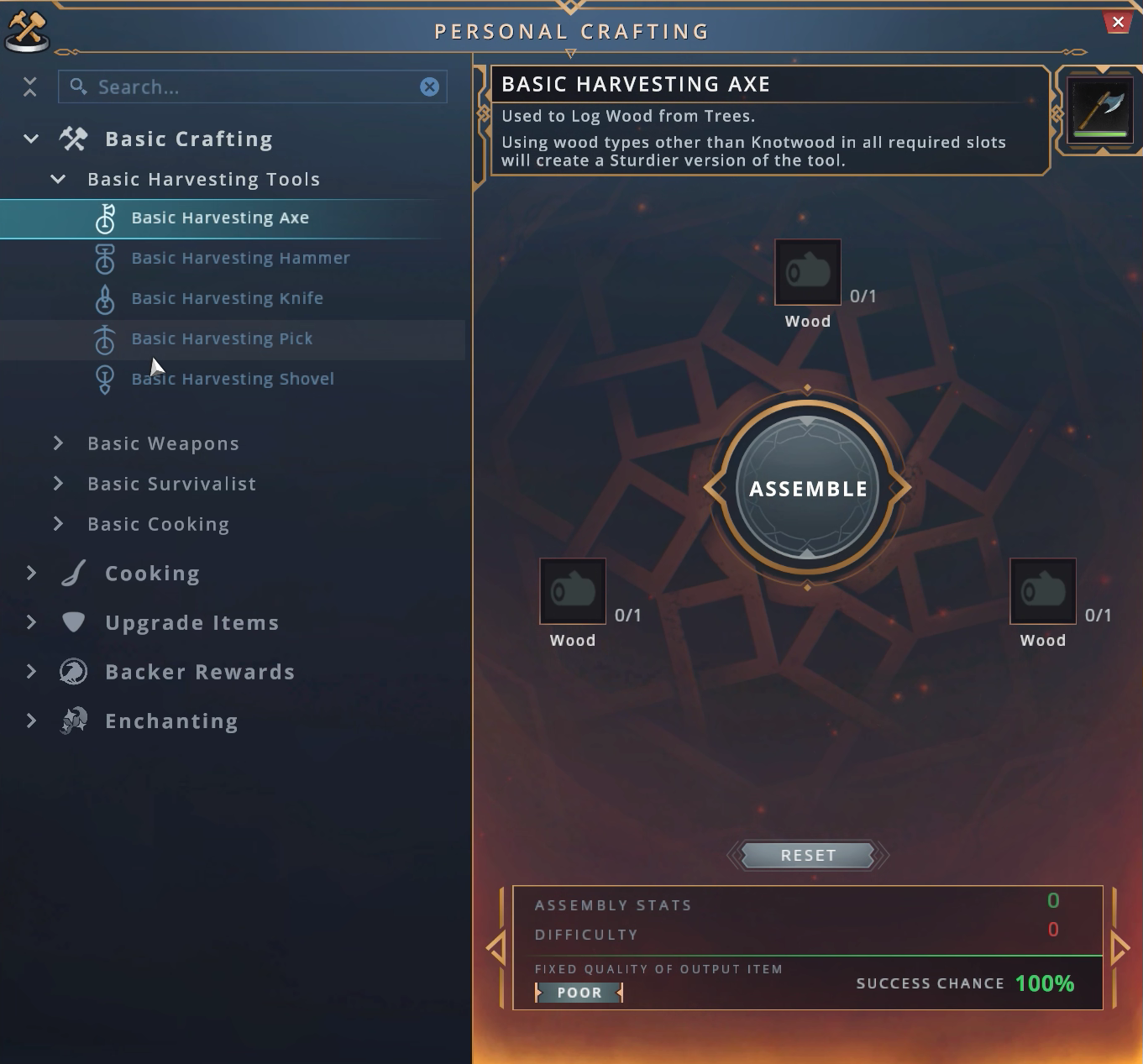 The crafting menu is something I personally dislike. For example, look at the Basic Harvesting Axe. You need to form a triangle of wood. Each slot takes 1 wood. What annoys me is I have to find it in my inventory and drag it over or click it in place. I wish it just showed me what is available in my inventory on this screen so I can quickly craft. I recall from the alphas there is much more than what is shown. I'm sure that comes later on in the game.