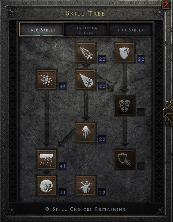 Let's start off with the skill tree first. Your trees should look like this. You max Frost Nova, Blizzard, Orb, Telekinesis, and then energy shield in that order. Make sure you put 1 point into Static, Warmth, and Frozen Armor. Warmth will give you additional mana regeneration, Static for those tanky bosses, and Frozen armor for some additional defense and freezing. You won't be able to max Energyshield, so it's important to keep putting as much as you can into it when you level.
