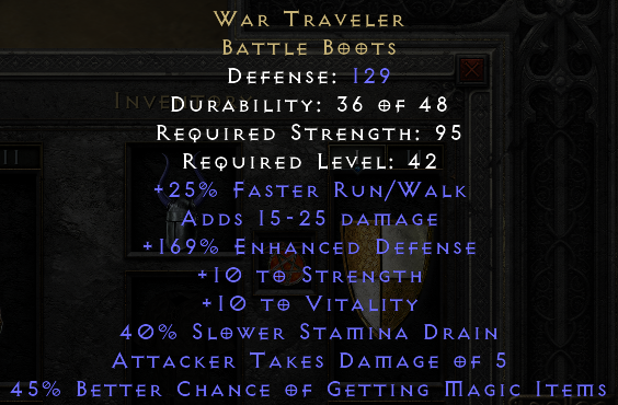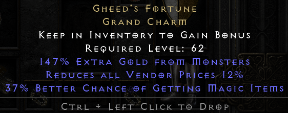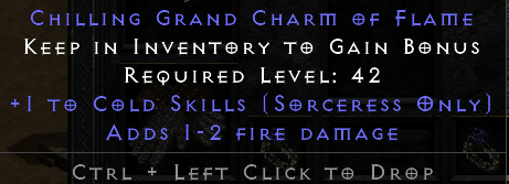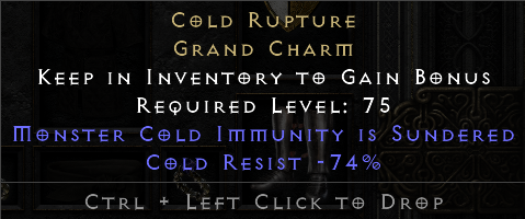 Inventory is pretty straightforward as well. You'll want your Torch, Anni, and cold Sunder charms always. The grand charms could then be all Cold Life Skillers, or you could throw in a Gheeds for more Magic find. Fill the rest of the slots with small charms of Life, Res, Magic find, faster hit recovery, or even mana charms. You'll have room for your TP book, and cube as well. You loot directly into your cube as your inventory is full. You can cut charms out if you don't like this.