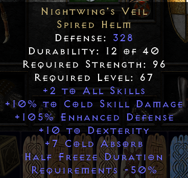 The gear is really just a standard cold Sorc setup. You're looking for + Skills, Cold damage, and - cold res to enemies. Life and Mana are also really big on this build as well. The normal things like Cast Rate and Faster hit recovery to your breakpoints are also important. This build does hit 105% Cast rate break point. You'll use a Call to Arms on your swap with a Spirit shield.
