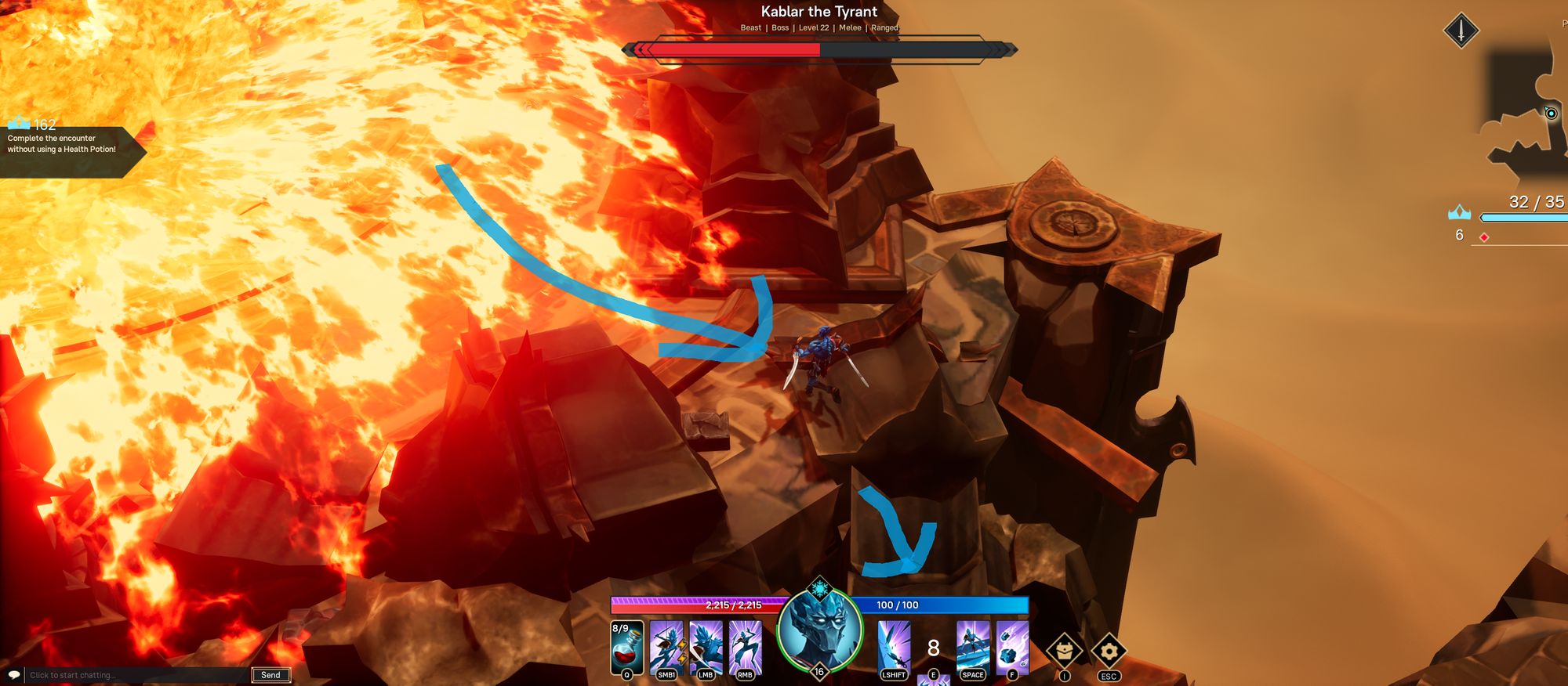 This fight left me stumped for a bit. I never noticed the falling tower in the top right corner. If you're here googling then you probably didn't either. This is an easy fight once you notice that part. At 50% Kablar will fly into the air. Run into the top right and you will see the big black pillar fall. Cross over it to the next stage.