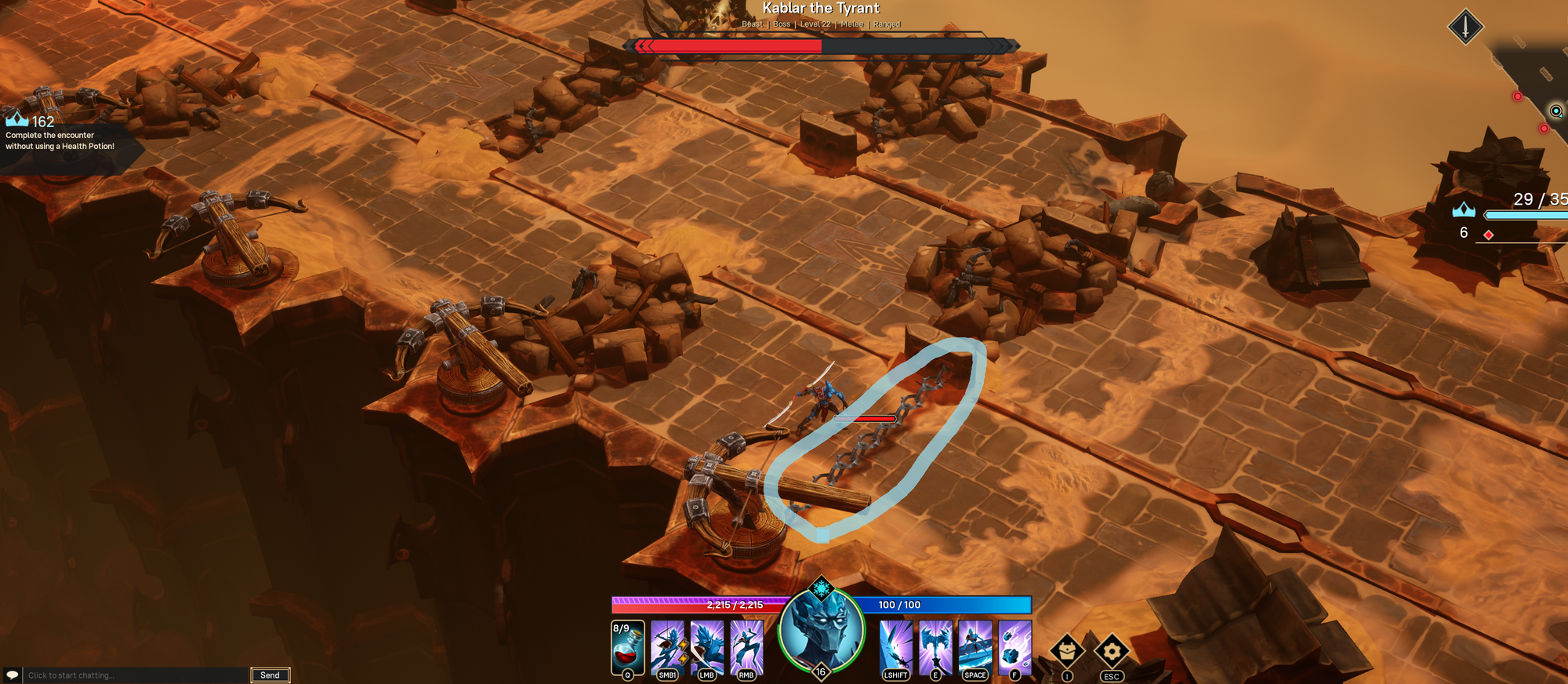 This part is super easy if you save your mobility skills. Just kill the chains until you reach the end. If Kablar catches you then he will kill you. Pretty sure it's an instant 1 shot.