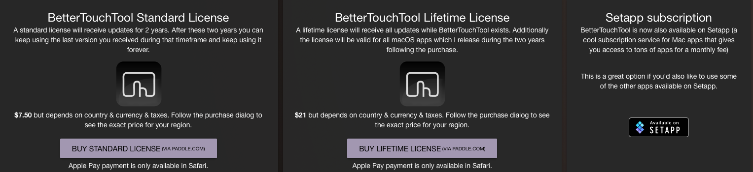 It's super powerful software for rebinding actions and even gestures. It also has some built in stuff like window snapping which actually replaced Magnet for me. It didn't take long for me to get it up and running, but the price wasn't that bad either. Looking at some other software that I would consider useful it was damn cheap. It does come with a 45 day trial. I used the trial for all of 10 minutes before I purchased a life time subscription. You can buy the software for $7.50, or a lifetime license for $21. You get 2 years if you opt out of the lifetime license. Another nice part of the lifetime license is this line right here.
