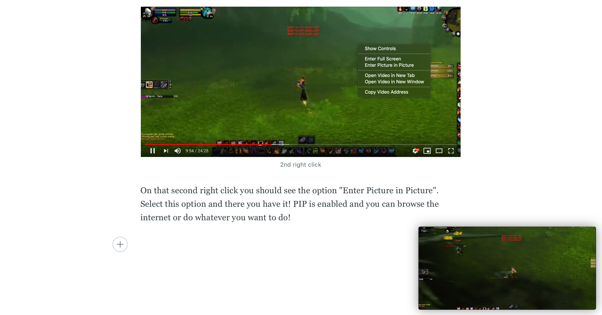 On that second right click you should see the option "Enter Picture in Picture". Select this option and there you have it! PIP is enabled and you can browse the internet or do whatever you want to do!