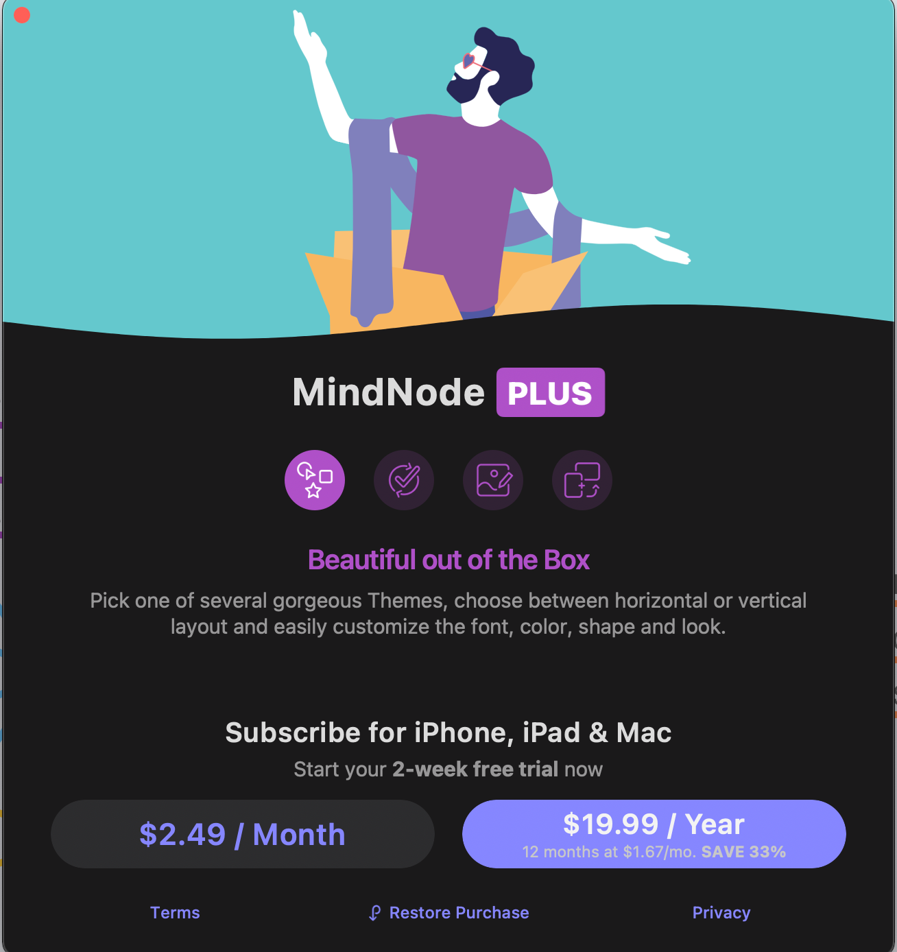 The company offers the app for free. That's currently what I use, as the unlocked features aren't something I need. My MindMaps are incredibly basic. Someone who has a lot more attention to detail and likes to be super organized may find purchasing the year-long subscription to be helpful. Of course, it also helps support the incredible devs.