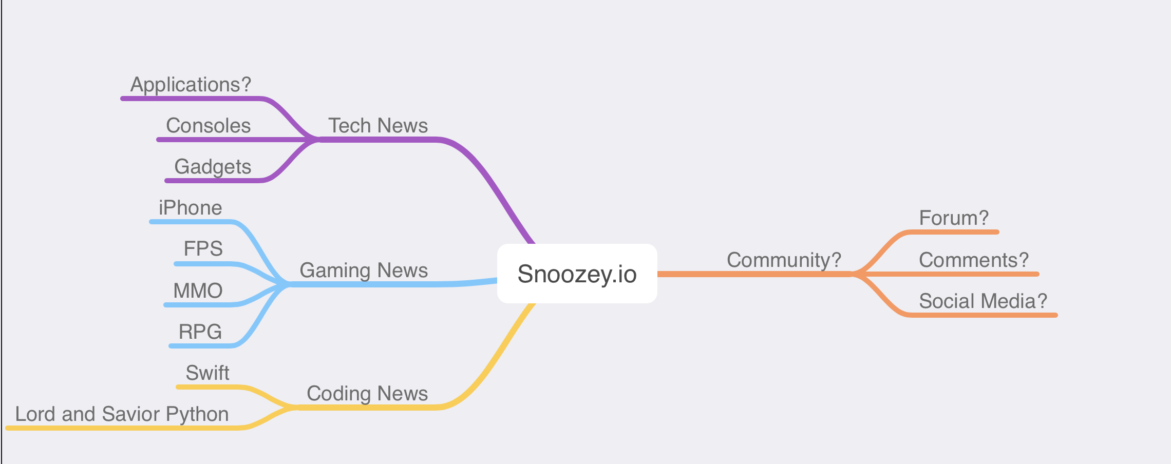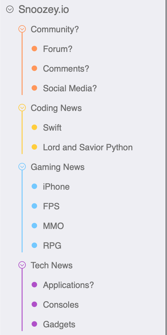 Above is just a quick mock-up of what I am planning for the website. I have multiple ideas but lack the tech skills to make these happen, so for now, the stuff on the right is things I would like to do, but need to improve my skills. On the left is all stuff I can cover with the website, and how each category will work together. One thing that I really enjoy is the simplistic few. With a few seconds, I can see how everything comes together, and how it branches out. The color-coding makes it simple at a glance. Any time I am thinking of designing another App I always start mocking it up with this. It helps keep the features in scope. I have a terrible habit of adding and adding until I am left with a bloated mess. If the map starts getting too big you can "fold" a branch down. For instance, you can make all the children off the blue "Gaming News" minimize out of the view. This helps you focus on certain branches without distractions.